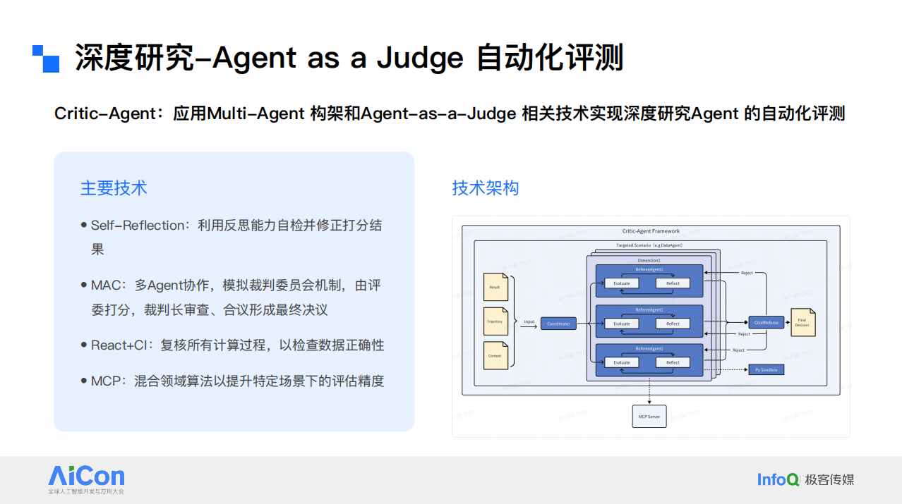 接下来谈自动化评估技术。这是业界相对前沿的话题,大家可能听过 "LLM as a Judge" 或 "LLM Judge"。我们最新的探索是用 Agent 来评测 Agent。原因很简单:写一份数据分析报告,没办法把数据直接丢给大模型就指望一次性产出完整结果,中间需要大量 Agent 能力来完成过程性的工作,所以在评测侧同样要引入 Agent 技术。