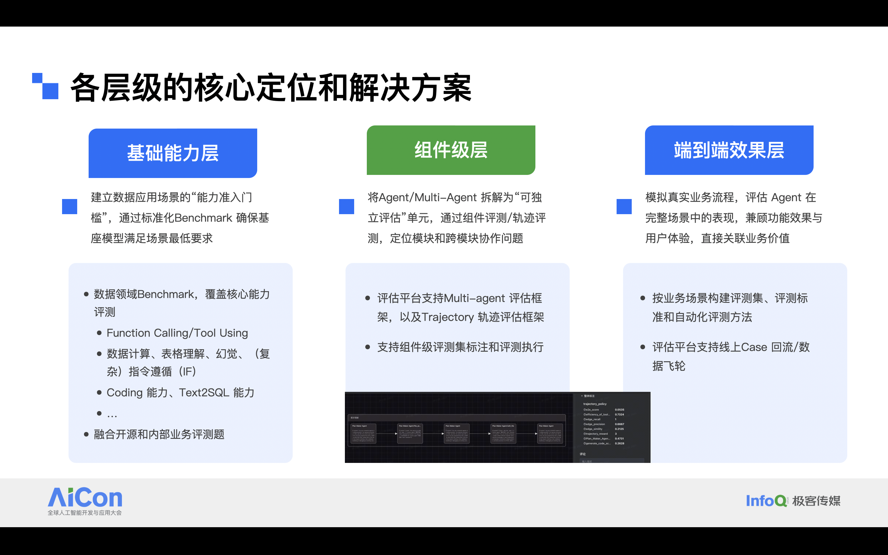 前面说的是数据领域里可能会遇到的问题。回到 Agent 这边,我们提出了一个"三层评测"的体系设计。在构建大模型的 Agent 应用时,通常会同时面对几层问题。