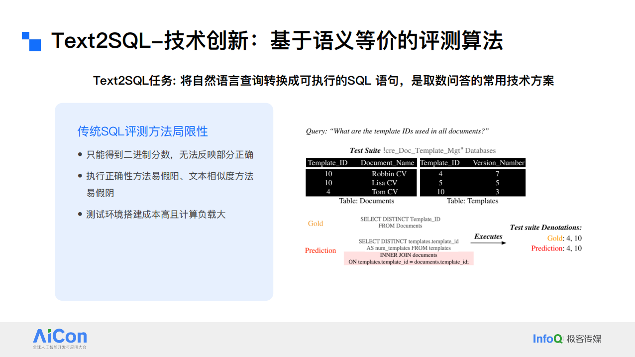 第三个问题,如果要在大数据引擎(比如 ClickHouse)上构造一套可用于回归测试的数据集,成本非常高。这些都是传统 Text-to-SQL 评测在实际落地中的局限。