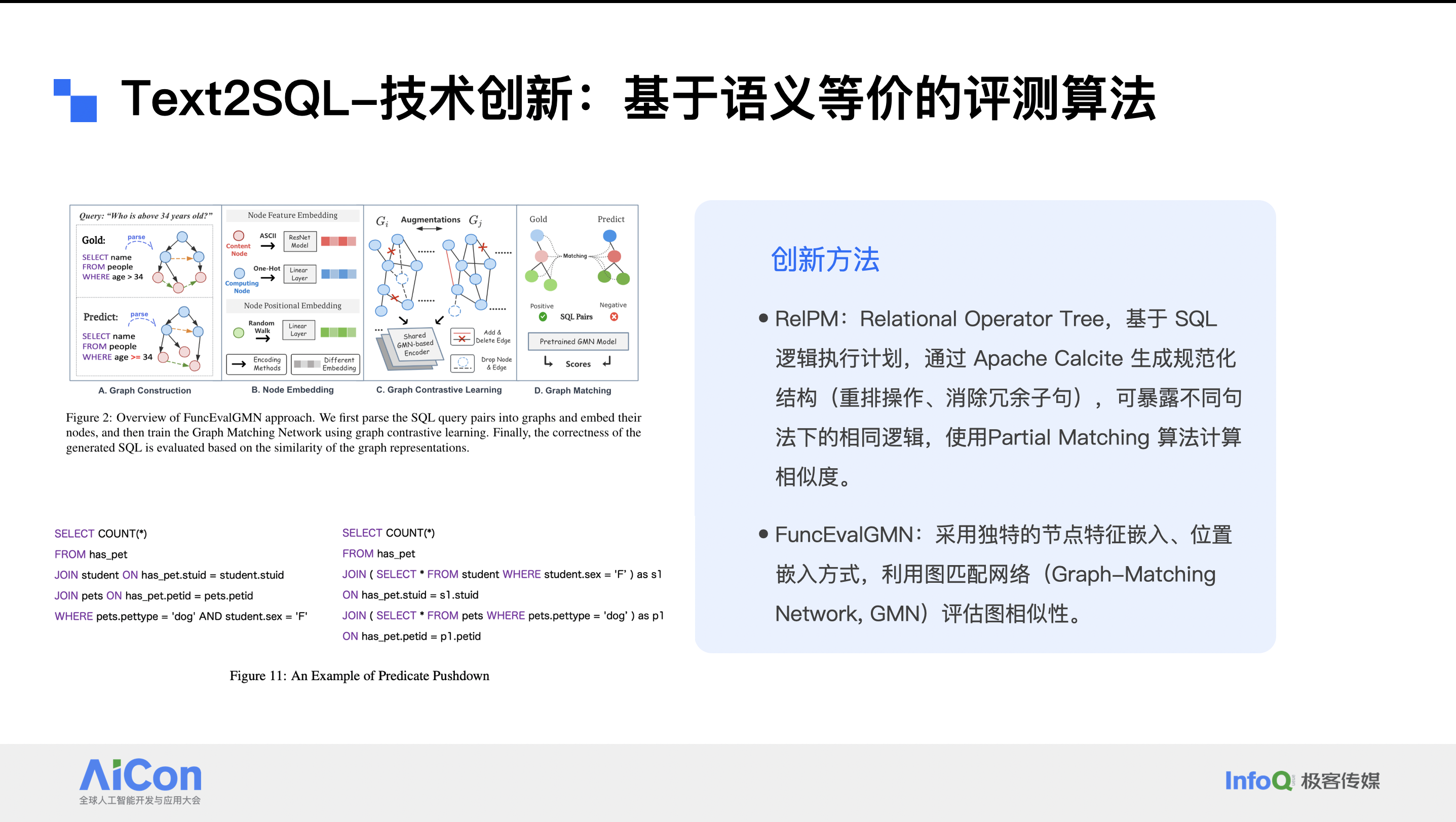 第二个方法,我们把节点之间的引用关系建立起来:参考答案是一张图,预测答案也是一张图,然后训练一个图匹配网络(Graph-Matching Network,GMN )来计算两条 SQL 在语法/表达上的相似度。基于语法树的匹配这一路,我们称为 RelPM (在执行层面的语法树上做 Partial Matching 的局部匹配):用规则做局部比对并赋权,得到 0~1 的相似度分数,已经明显优于传统做法。进一步,在 FuncEvalGMN 上,无论对比基于执行正确性的评测、基于文本/语义相似度的评测,还是一些基于 BERT 的预训练模型,我们的效果都有显著提升。在业务侧,这套方法也已经成为我们数据领域的核心算法之一。
