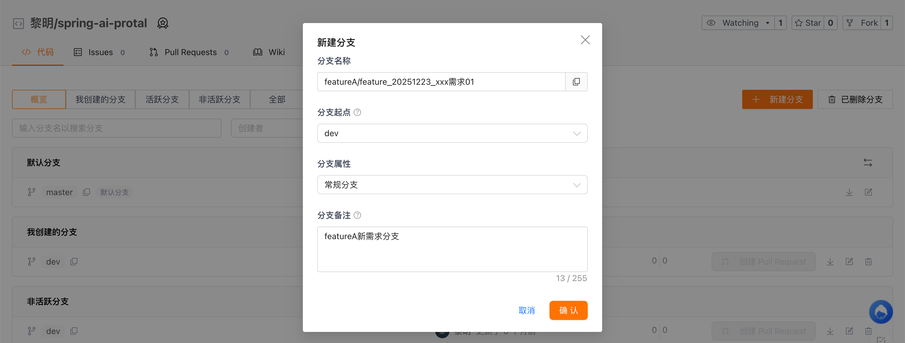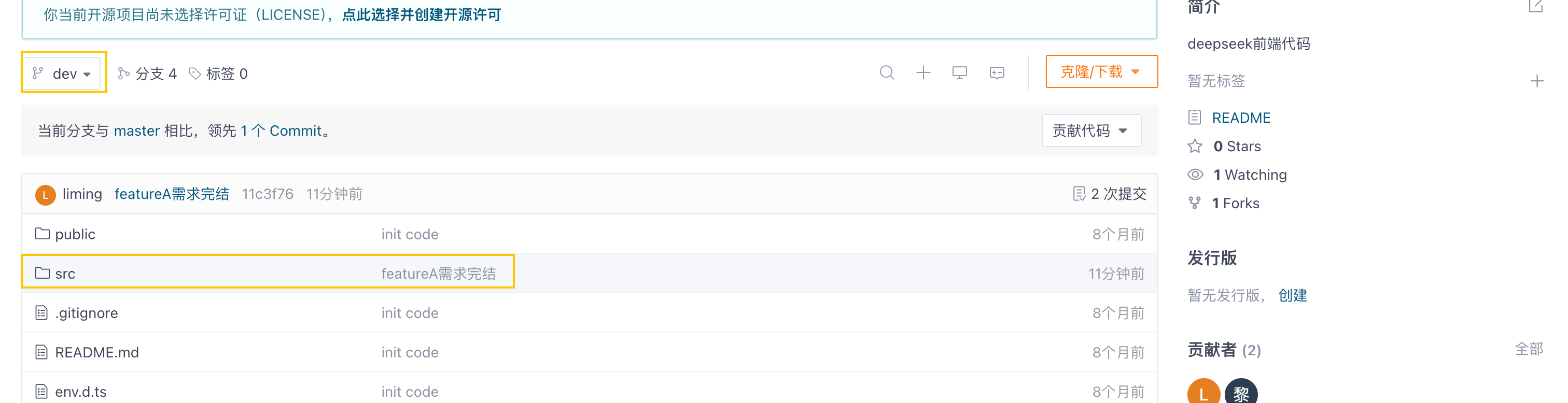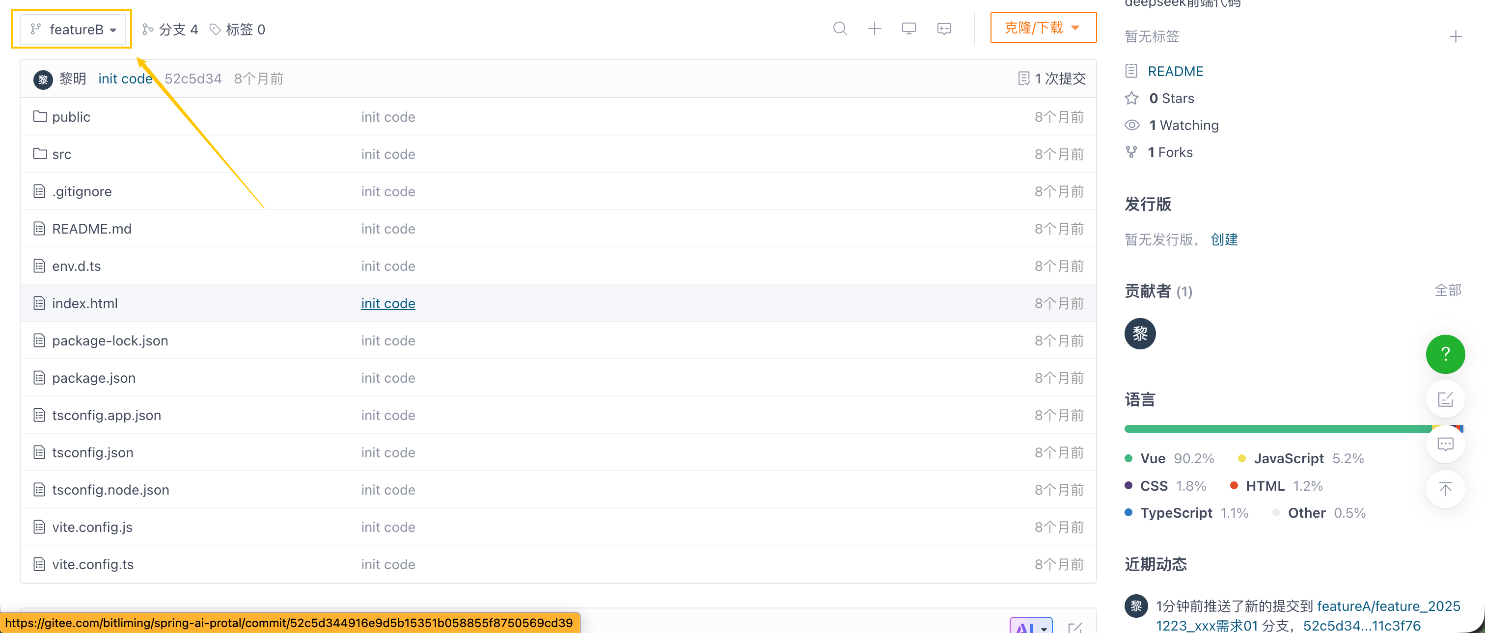 featureA 分支上修改代码,并提交到 gitee 看效果