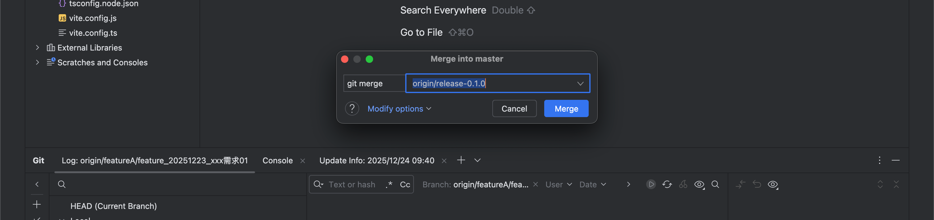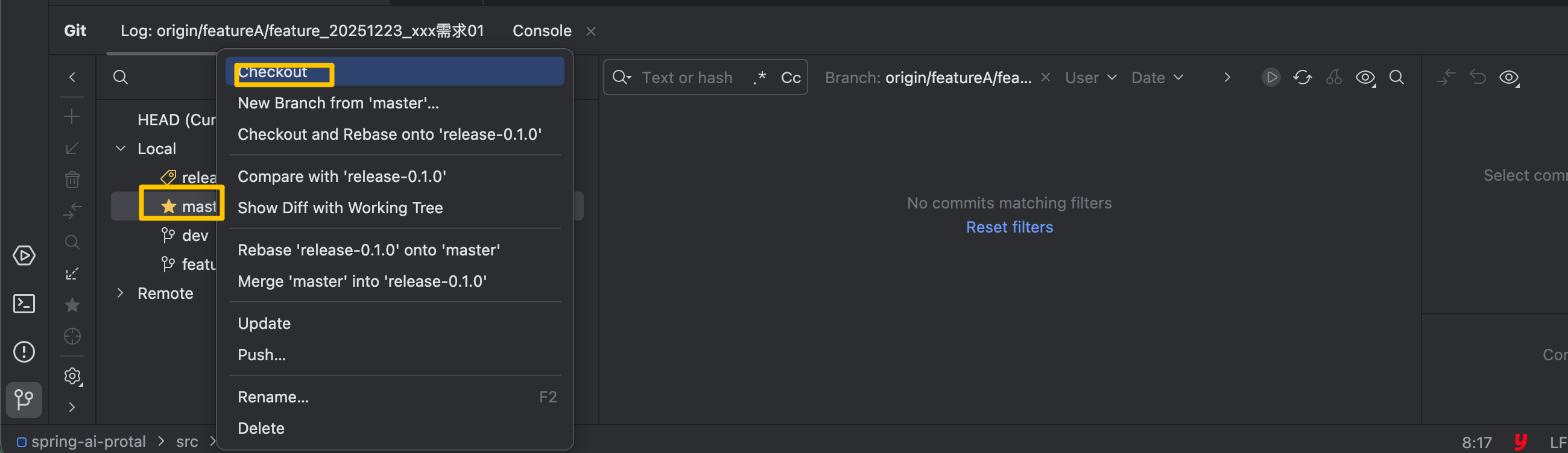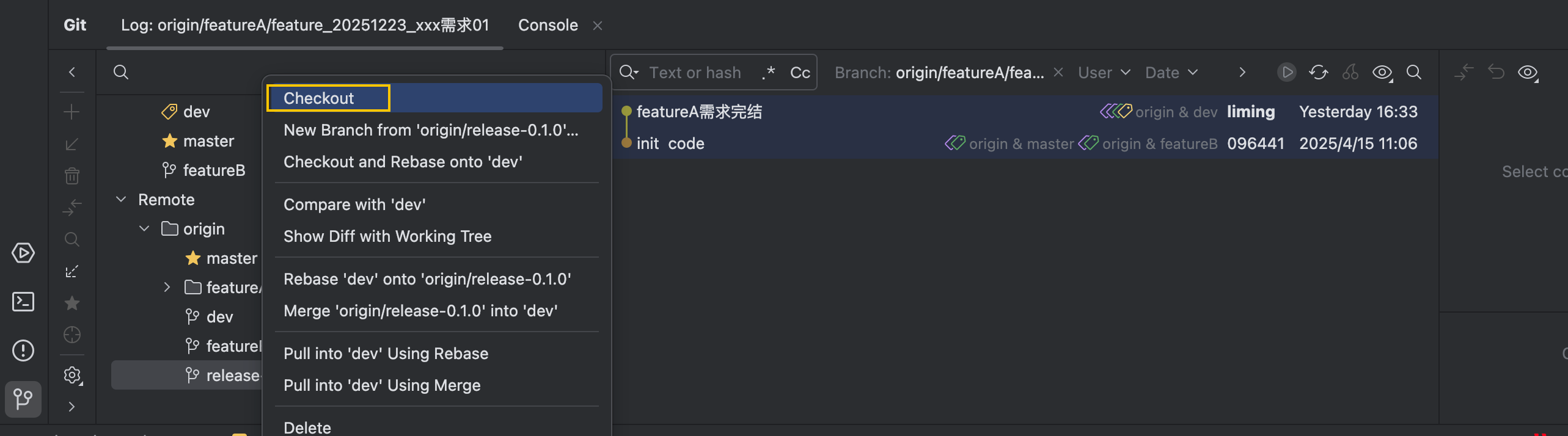 打开 idea git pull 同步分支,然后将release-0.1.0 分支从 remote 检出到 local