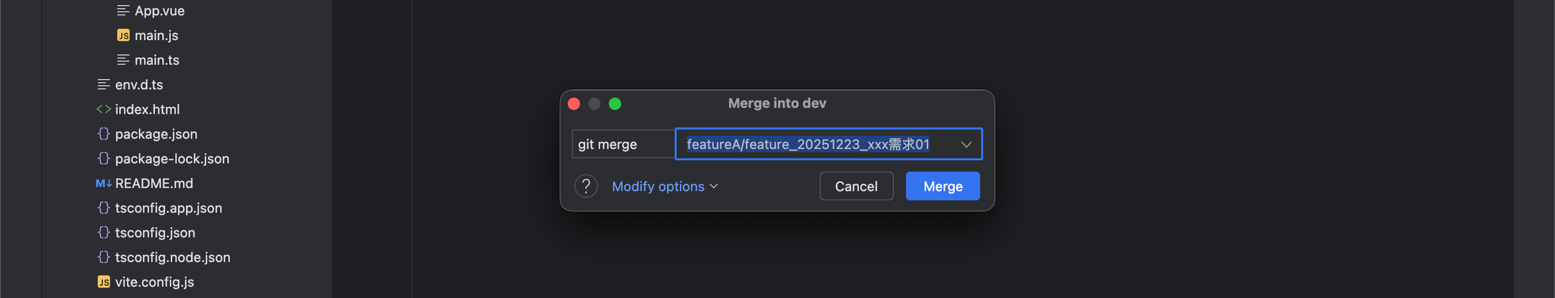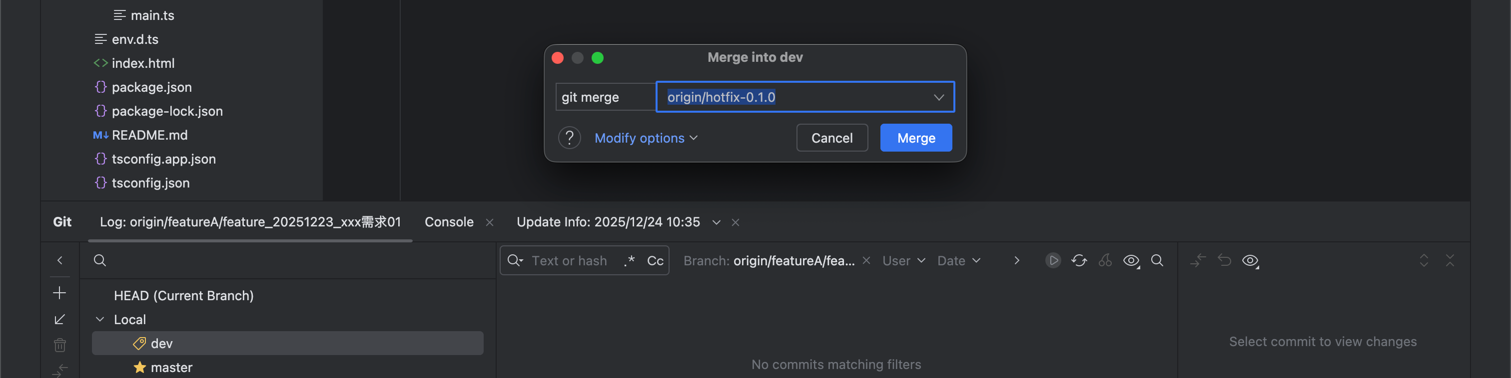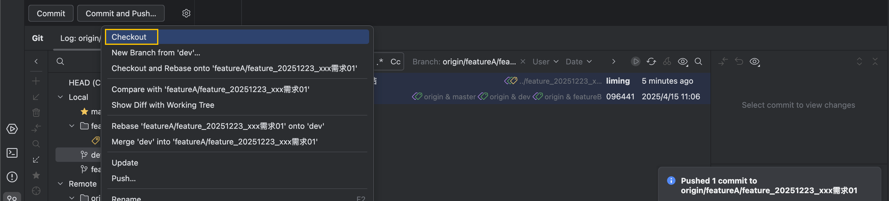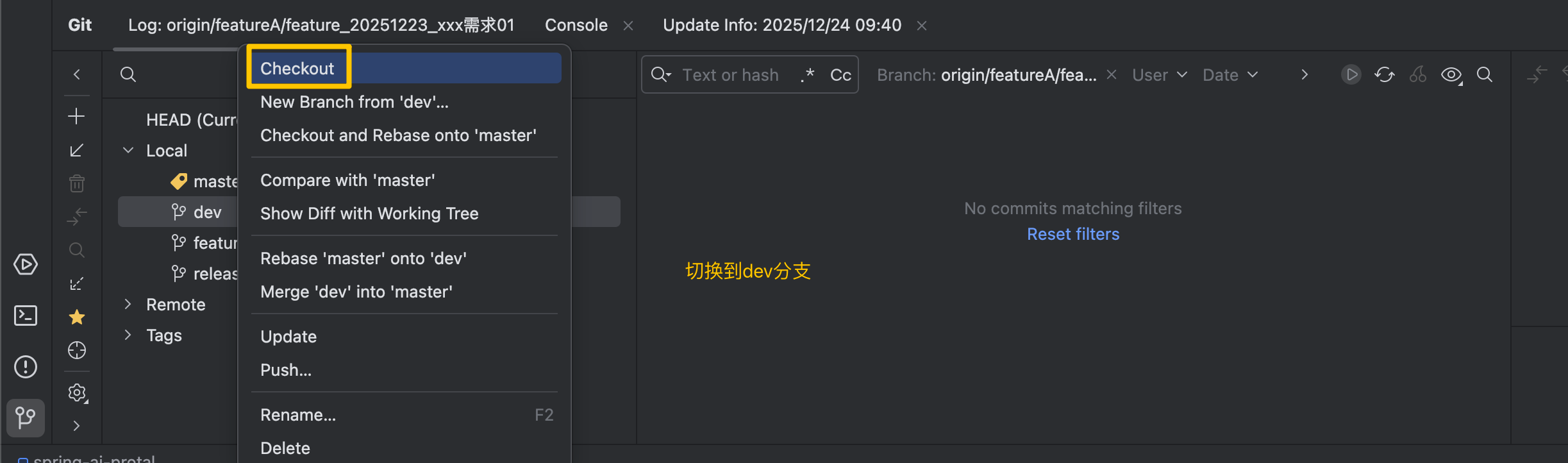 将刚才本地完成的featureA 分支功能合并到 dev 分支