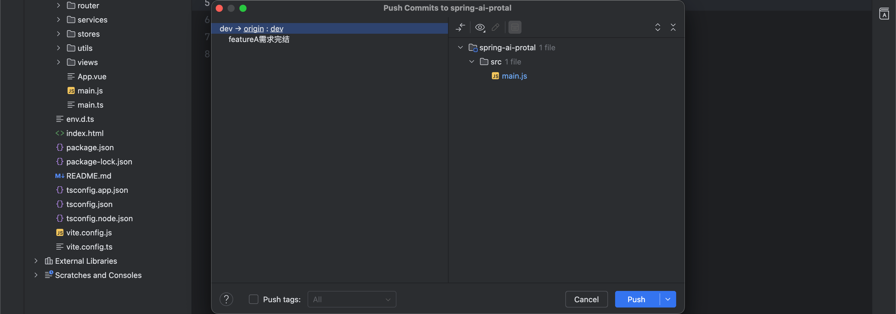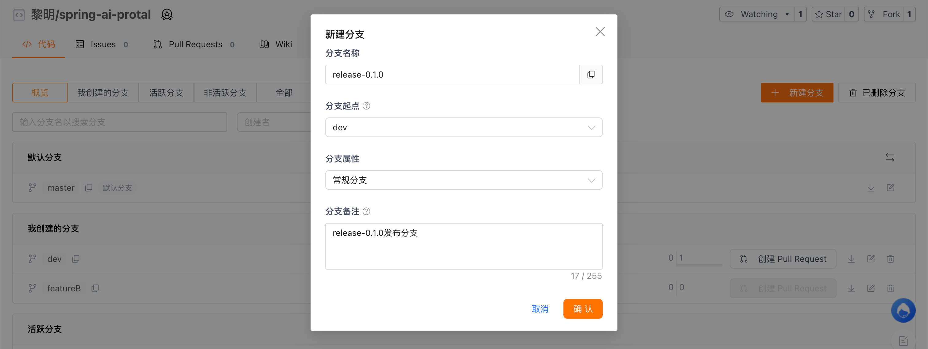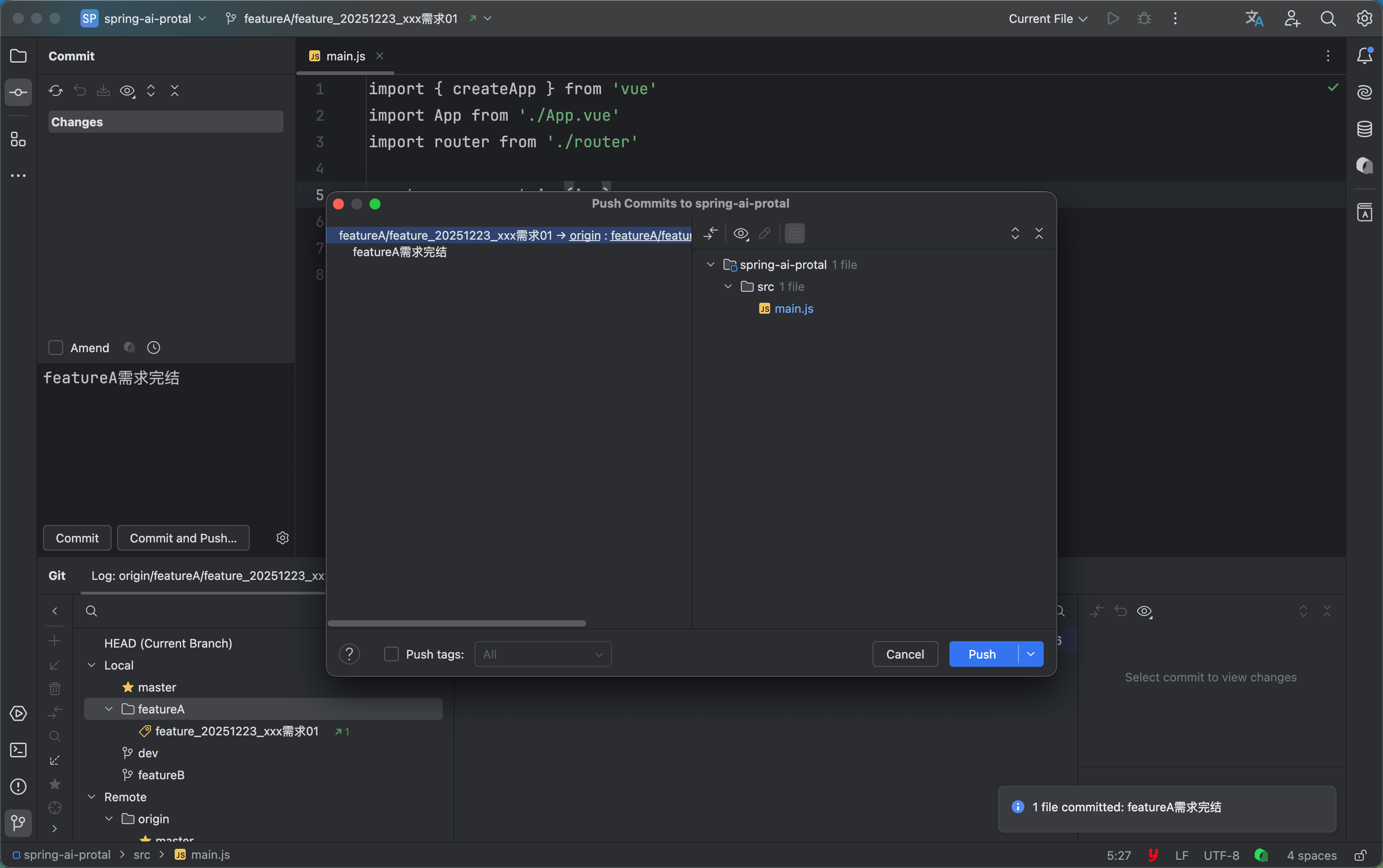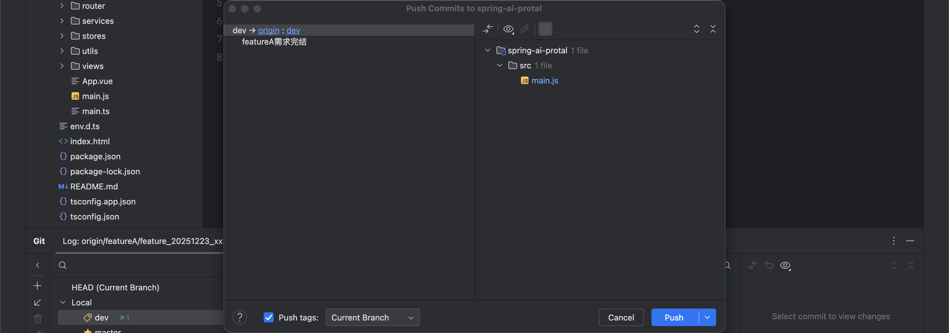 将刚才本地完成的featureA 分支功能合并到 dev 分支