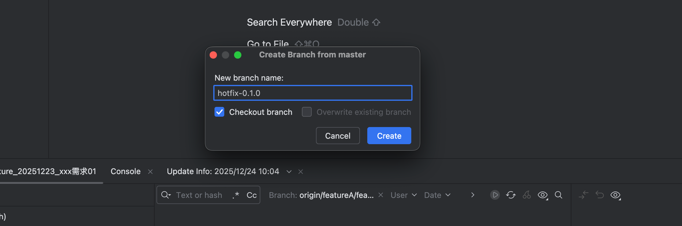 切换到 master 分支,在 master 分支上新建hotfix-0.1.0 分支