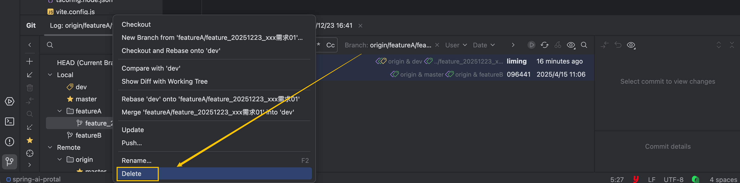 新需求完成后删除本地 featureA 分支,远程可删可不删