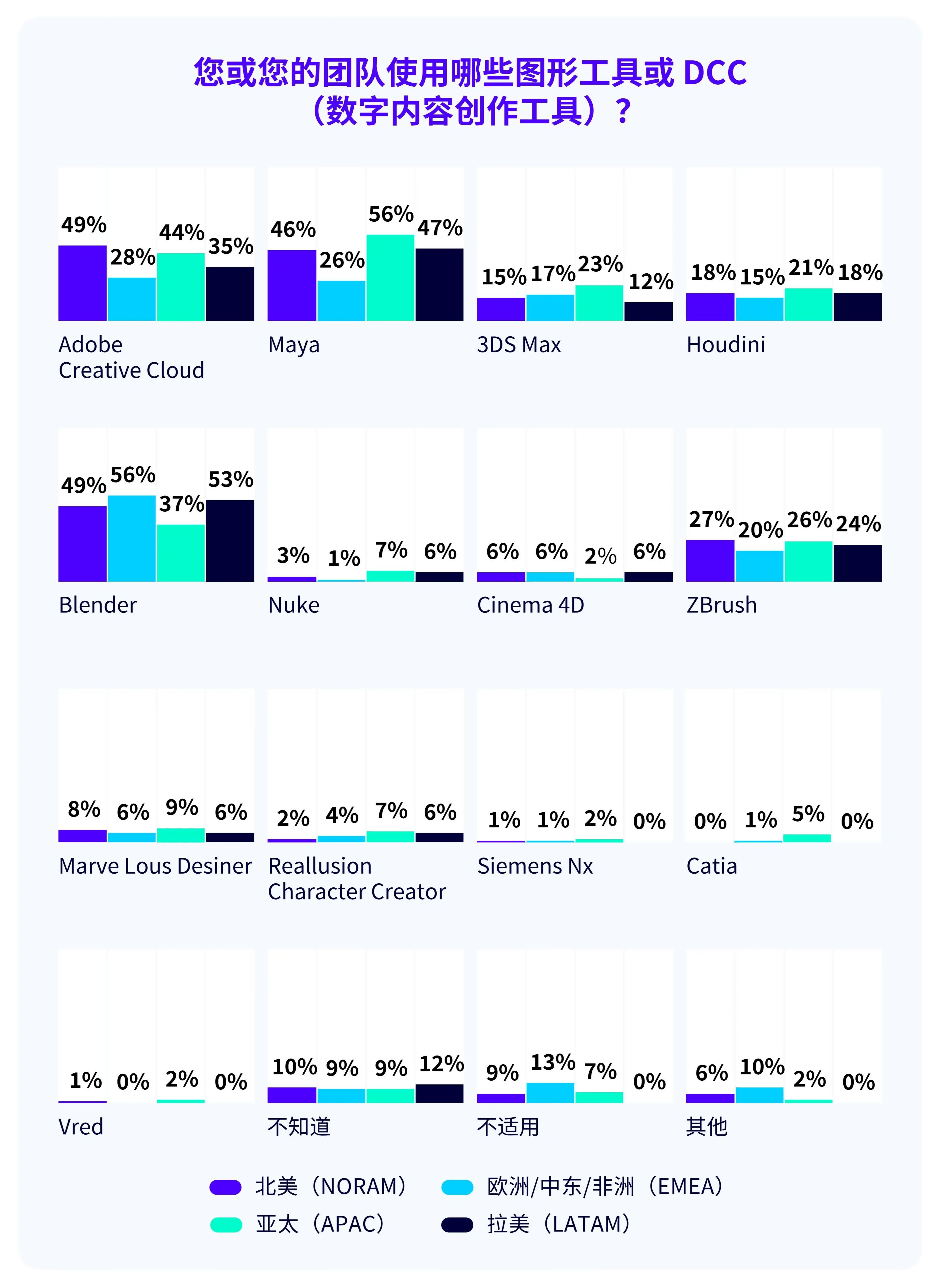 EMEA 与 LATAM:Blender 使用率较高(分别为 56% 和 53%),得益于其开源特性与协作性,契合注重成本与社区导向的创意行业。