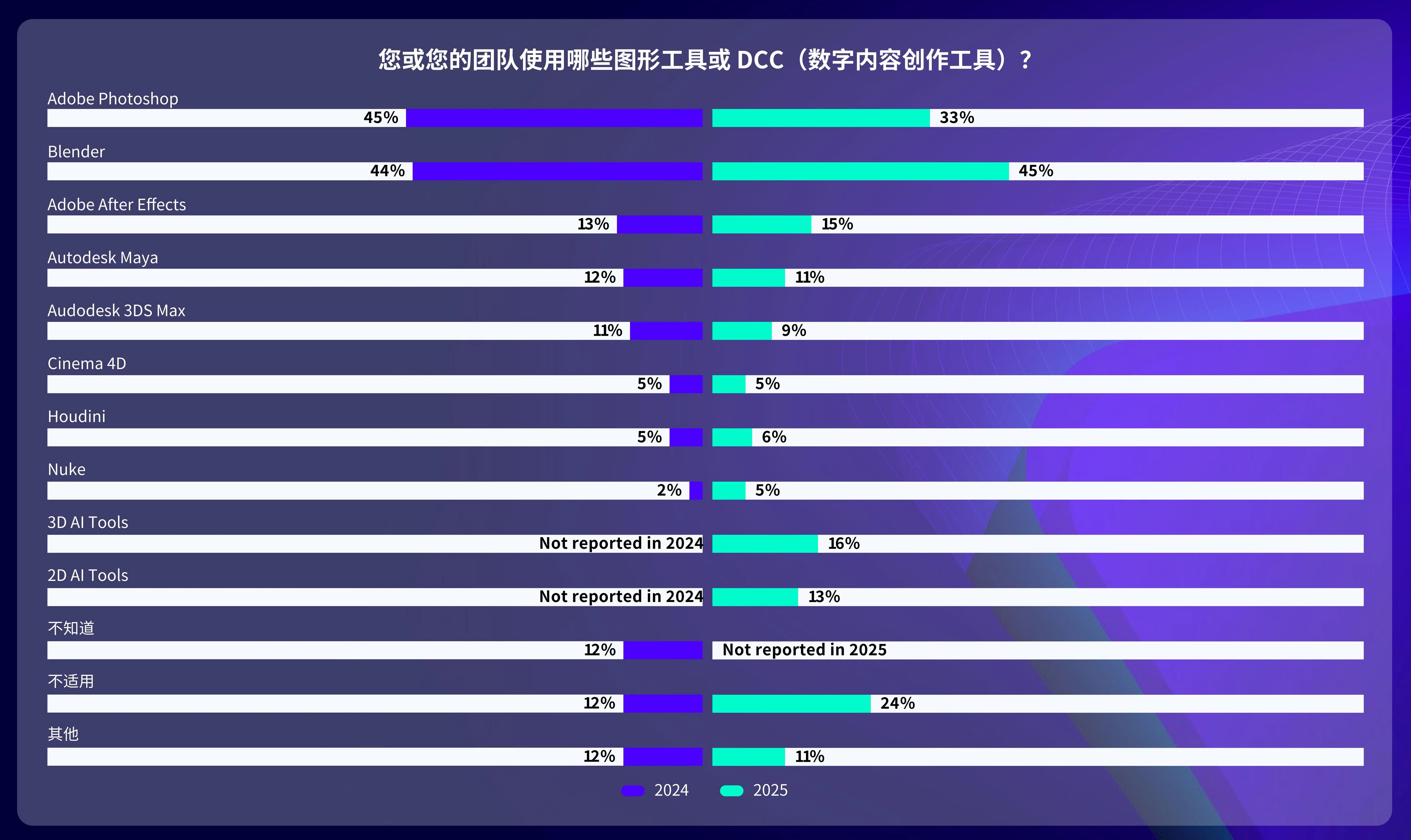 除了这些核心应用,专业工具也保持着关键地位,其中 ZBrush 被 25% 的受访者使用,Houdini 的使用率也小幅增长至 17%。