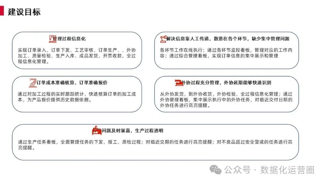 本方案的核心目标在于通过智能化手段解决上述痛点,实现管理过程的全面信息化,确保订单信息的准确传递与集中管理,提升订单成本的核算精度与报价准确性,及时暴露并处理异常问题,同时加强对外协过程的有效监控与管理,确保生产过程的透明化和高效化。