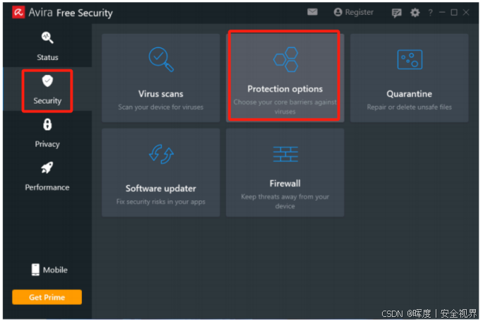Security(安全) 面板,点击Protection Options(防护选项) 。