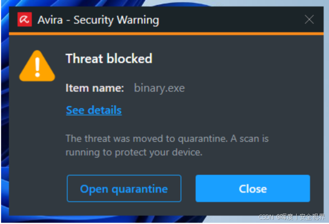 结果 :文件传输后立即 触发Avira警报,弹窗明确提示文件已被判定为恶意并遭到阻止 。