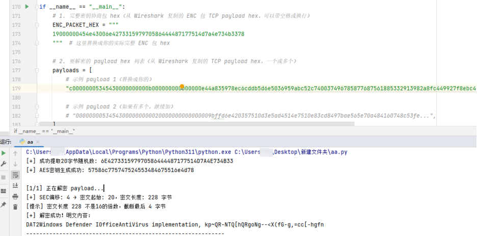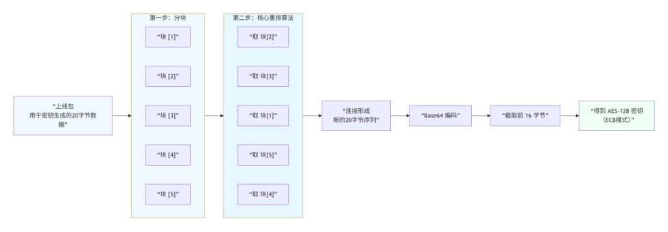 该类样本采用动态密钥生成机制,不依赖硬编码密钥。在每次会话初始化阶段,客户端生成20字节随机数,通过固定规则转换为AES-128会话密钥:首先将随机数依次等分为5个4字节块,再按[2]、[3]、[1]、[5]、[4]顺序重组;随后对重组数据进行Base64编码,并取其编码结果的前16字节作为最终密钥,加密模式采用ECB。此设计实现"一会话一密钥",显著提升了通信的随机性与抗分析能力,所有后续通信数据均使用此密钥通过AES-ECB模式进行加密传输。