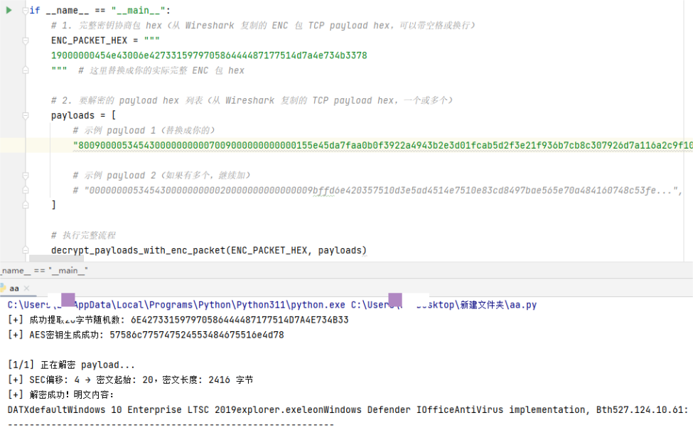 该类样本在完成密钥协商后,客户端会立即发送一个结构固定的上线包。该数据包解密后以"DAT"为起始标识,其内容为按固定顺序拼接的多项系统信息,主要包括:操作系统详细版本、当前执行进程名、计算机主机名、安全软件信息以及C&C服务器地址。例如,在下图已解密的通信中可观察到"Windows 10 Enterprise LTSC 2019"、"explorer.exe"、"Windows Defender"等字段,从而全面获取受害主机的初始信息。具体解密数据见下图。
