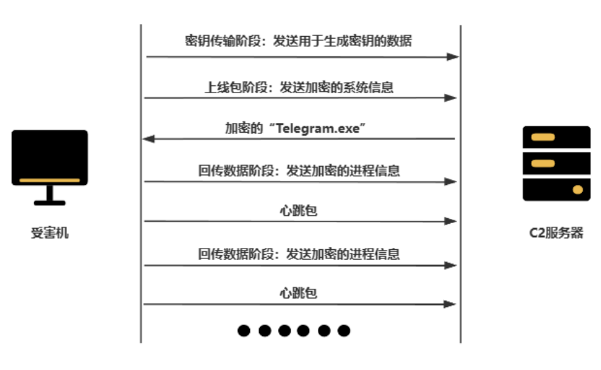 该类银狐样本使用TCP协议与C&C服务器(27.124.10.61)进行通信,其完整通信交互流程如下:客户端首先发送用于派生AES密钥的随机数据;随后,发送一个由固定格式组成的加密数据包,内容为受害主机的详细系统信息;服务器在成功接收上线信息后,会回复一个加密数据包,其解密后为"Telegram.exe"字符串。此后客户端会持续回传多条由固定格式组成的加密进程信息,并在整个会话期间,以5秒为固定间隔发送心跳包以维持连接活性,形成持久化通信模式。