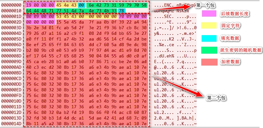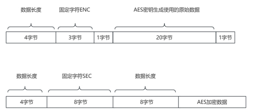 在通信初始化阶段,客户端依次发送两个固定格式的数据包。第一个数据包负责传输密钥派生所需的随机数,其结构依次为:4字节后续数据总长度、3字节固定标识"ENC"、1字节填充、20字节随机数及1字节填充。第二个数据包用于传递加密信息,其结构为:4字节总长度、8字节固定标识"SEC"、8字节加密数据长度,以及使用AES-128-ECB模式加密的密文数据。详细数据格式见下图。