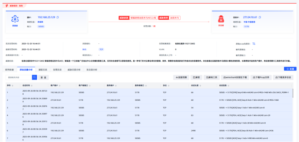 在上一篇文章《以道高一丈,破加密魔盒-银狐木马最新变种加密技术全面揭秘》中,我们系统揭露了银狐木马在2025年主要采用的三类新型加密通信方式。近期,观成安全研究团队再次捕获到一个新的银狐木马变种(文件哈希:918045d9938fc260e6ec477b1bc1f8c30130ec6d1190053affa3d1263091e012)。分析发现,该变种并未沿用此前已披露的主流加密模式,转而采用了一套全新的加密通信方案,其核心特征包括基于随机数动态派生密钥实现的"一会话一密钥"机制,以及新的数据包结构等。本报告将从通信交互流程、加密算法、数据格式、上线包、后续回传数据包和心跳包等多个技术维度,对该变种的通信机制进行全面剖析。