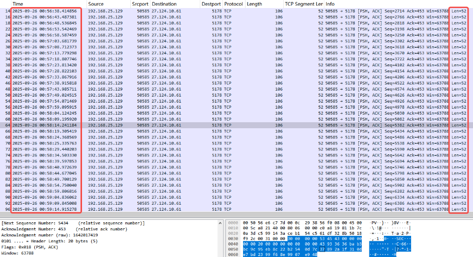 为维持连接,该类样本以5秒为固定间隔向服务器发送心跳包,且数据包长度保持不变。心跳包在发送前会使用当前会话协商的AES密钥进行加密,解密后的内容为固定字符串"DAT"。该行为在时间、长度与内容上具有高度规律性。详见下图。