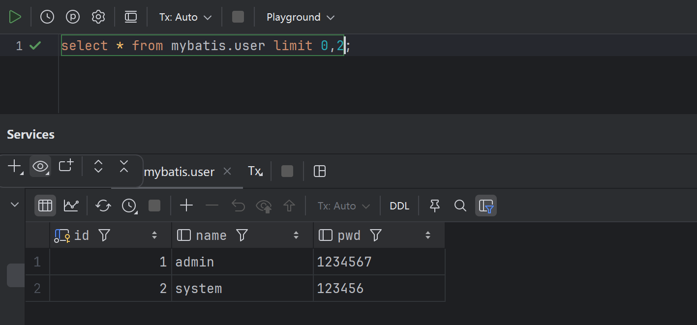 数据库中的列是pwd,实体类中的属性是password,进行结果集映射-->