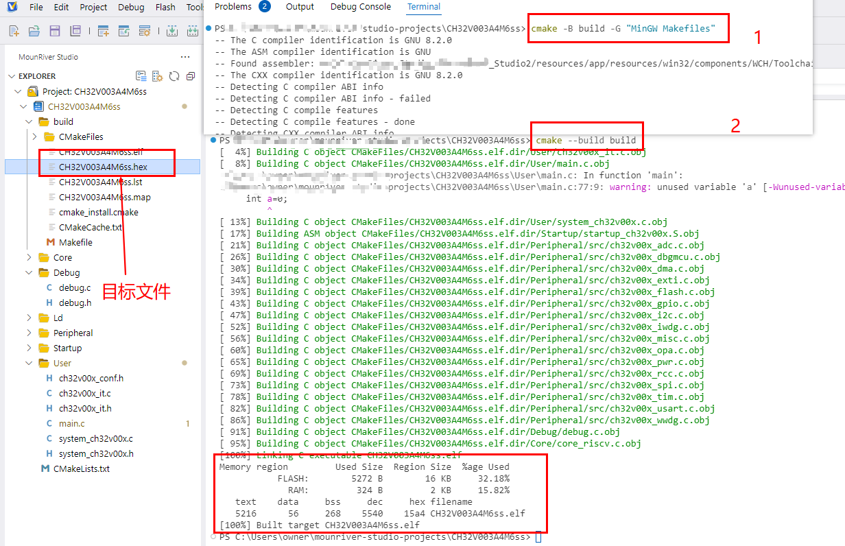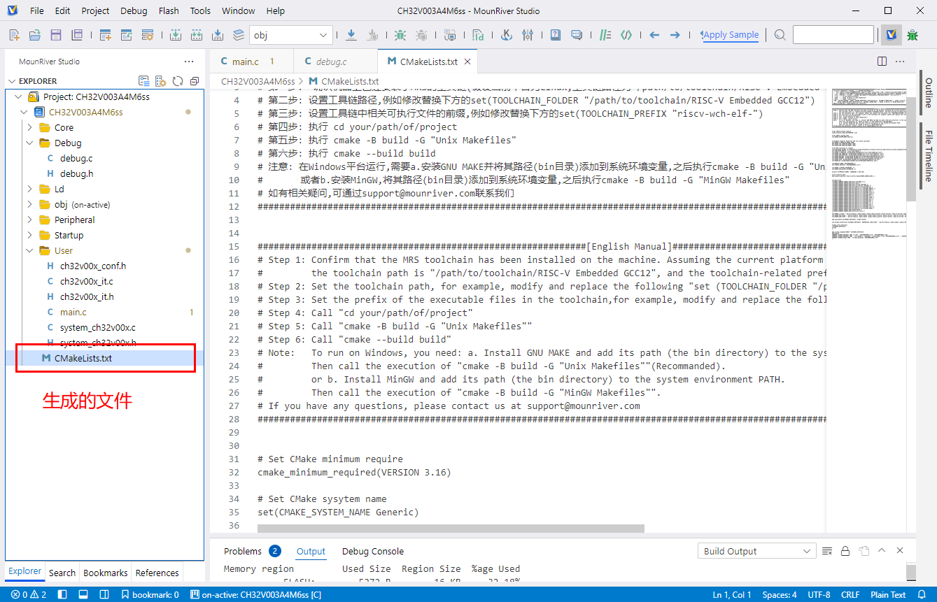 a.机器上安装MRS的工具链, 设置工具链路径, CMakeLists.txt中修改替换工具链路径参数的set(TOOLCHAIN_FOLDER "/path/to/toolchain/RISC-V Embedded GCC12"),修改替换工具链浅醉前缀参数set(TOOLCHAIN_PREFIX "riscv-wch-elf-")