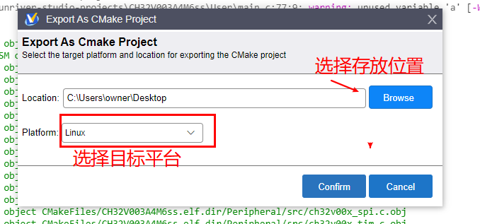 在弹出来的对话框中选择导出的工程希望存放的位置,Platform下拉框选择目标平台类型(导出的CMake工程的运行平台)。之后点击Confirm按钮确认导出。