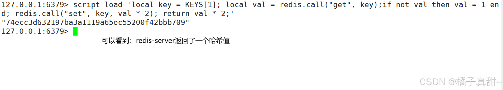 首先使用 script load 加载lua并且返回一个哈希值(此时末尾不需要带上我们的key参数)