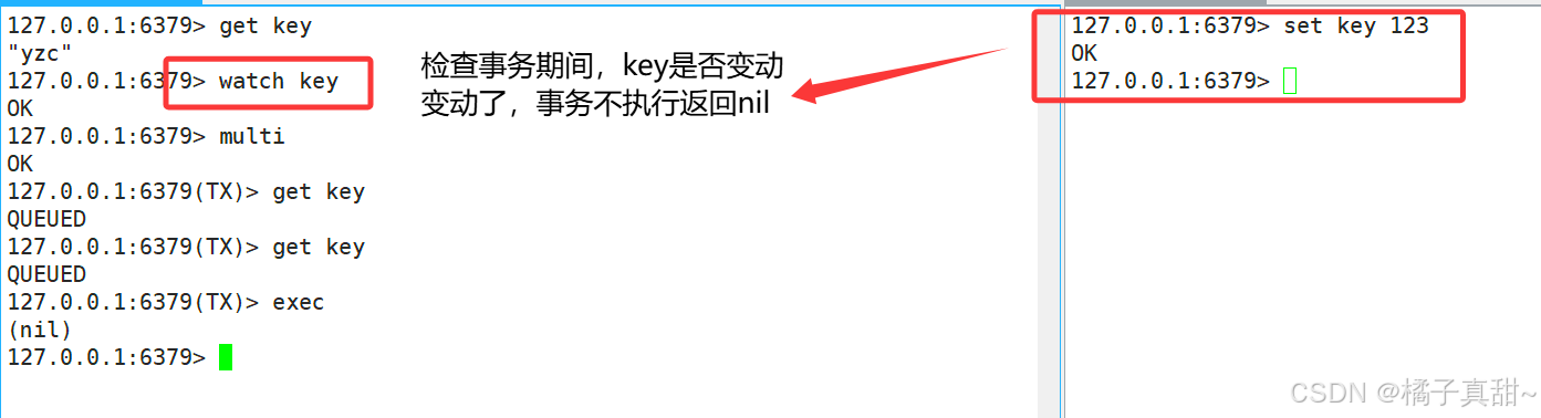 调用了watch,如果检查到key变动,这个事务不执行,返回nil