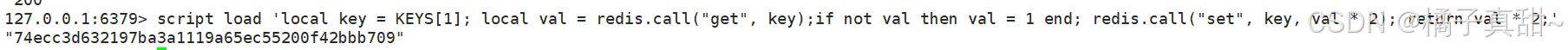 script load 'local key = KEYS[1]; local val = redis.call("get", key);if not val then val = 1 end; redis.call("set", key, val * 2); return val * 2;'