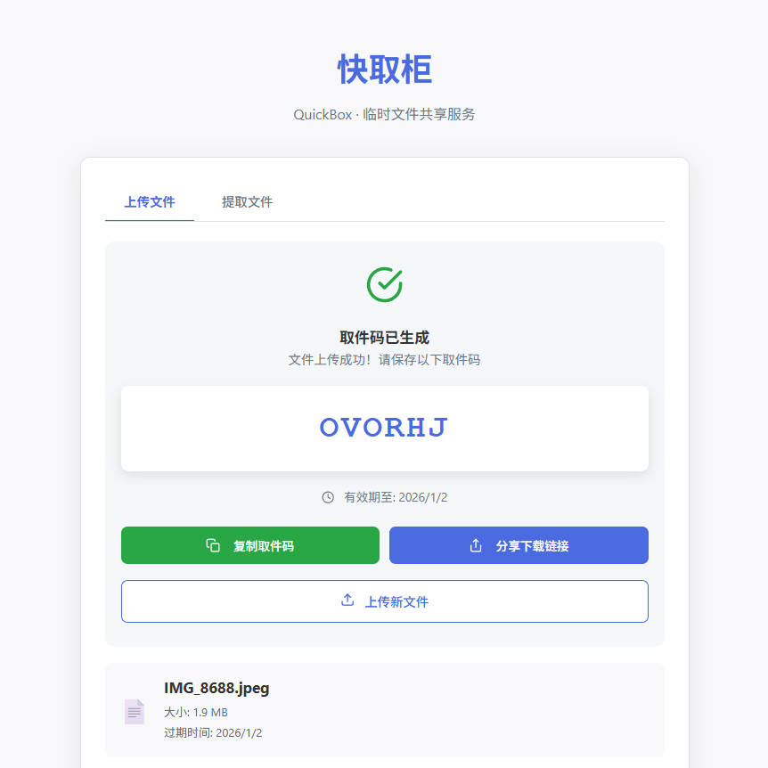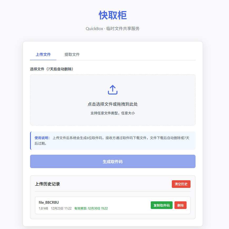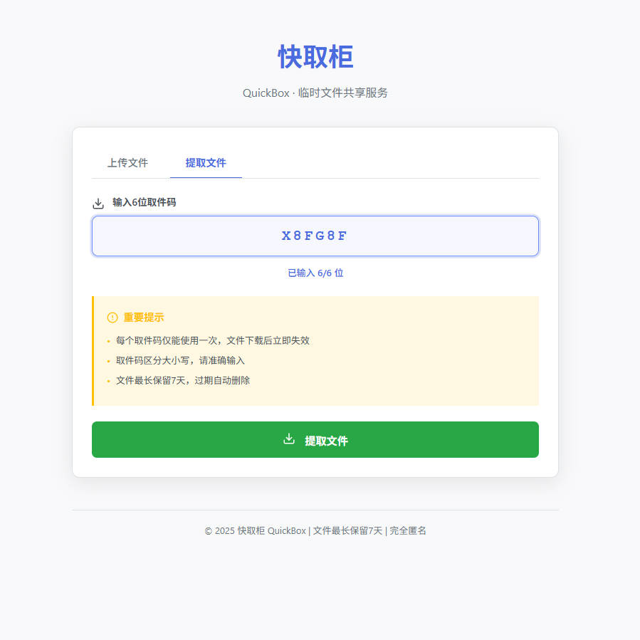 - 🔐 取件码机制:上传后生成 6 位取件码,接收方输入即可下载,下载后文件立即失效