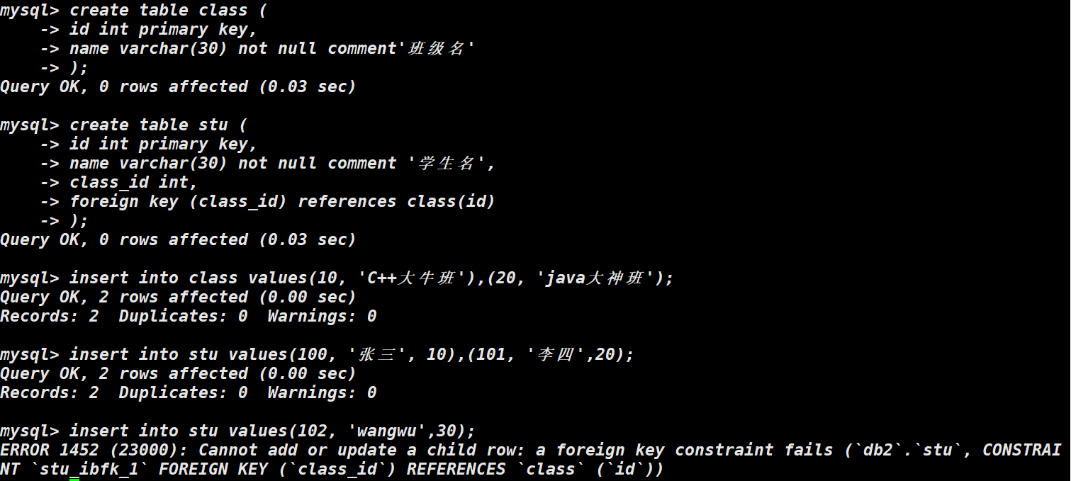 插入一个班级号为30的学生,因为没有这个班级,所以插入不成功