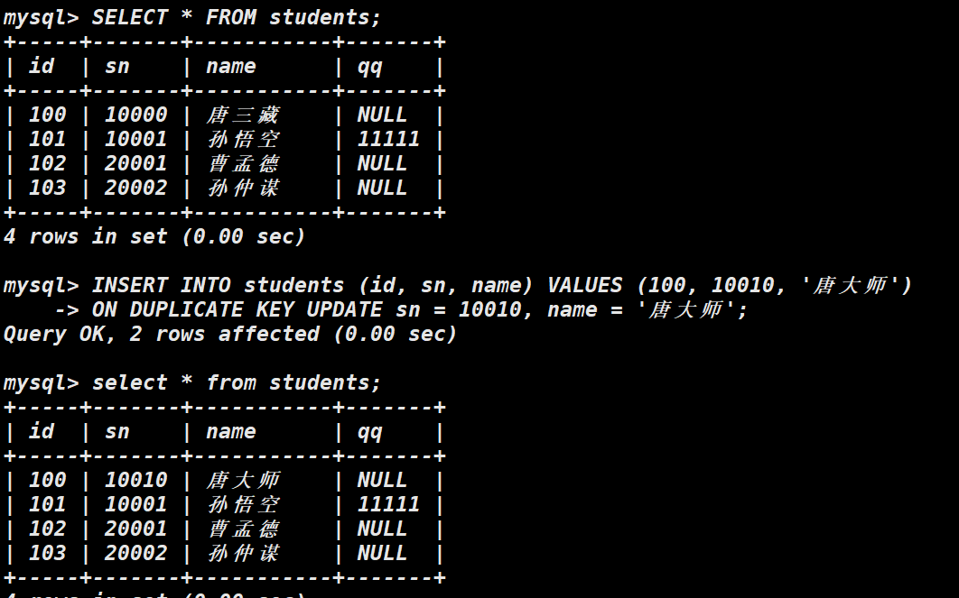 on duplicate key update,检查表中是否存在该主键的数据,若不存在直接插入,若存在则覆盖插入