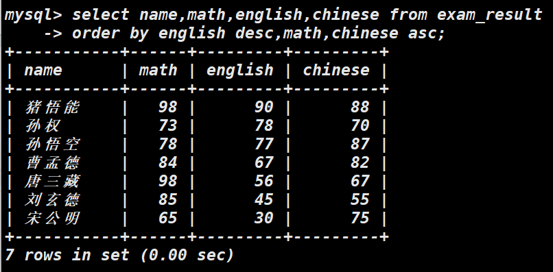 我们通过下面案例可以观察,多个排序是按照第一个优先,在第一个一样的基础上才会进行第二项排序。当我们不加desc或者asc,默认情况下是采用asc(升序),所以我们使用时只用desc即可