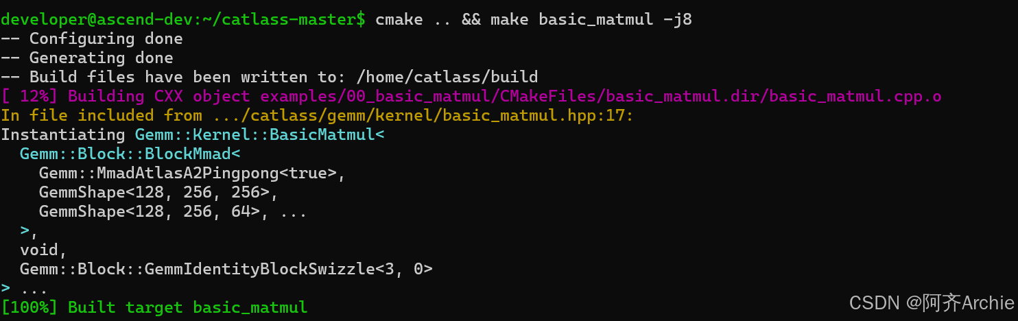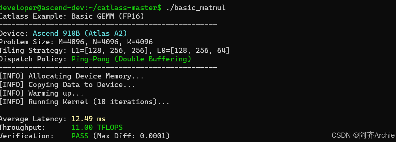 运行示例中的.basic_matul程序:程序执行 4096×4096×4096 规模 FP16 精度 GEMM 矩阵乘法的过程与结果,通过 Catlass 的切分、双缓冲调度策略实现了规则场景下数据在 HBM/L1/L0 间的高效搬运,取得了低延迟、高吞吐量且精度达标的执行效果,也印证了复杂场景下需自定义搬运逻辑优化调度策略的必要性。