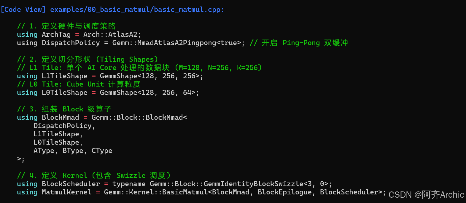 编译时,模板元编程引擎会根据提供的 GemmShape 和 DispatchPolicy,自动展开循环,插入同步指令 (SetFlag/WaitFlag),并生成针对 Atlas A2 优化的指令序列。