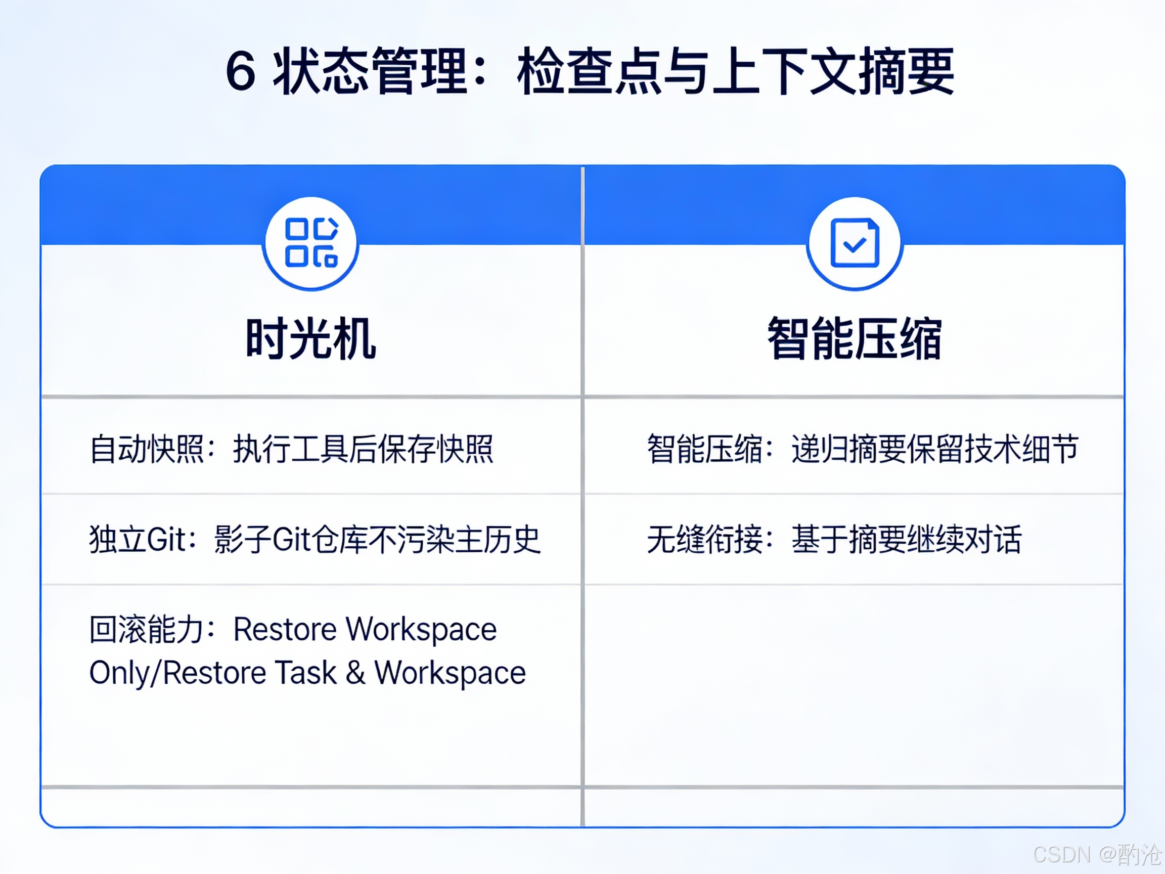 独立于 Git: 这套机制使用影子 Git 仓库,不污染你的主 Git 历史。