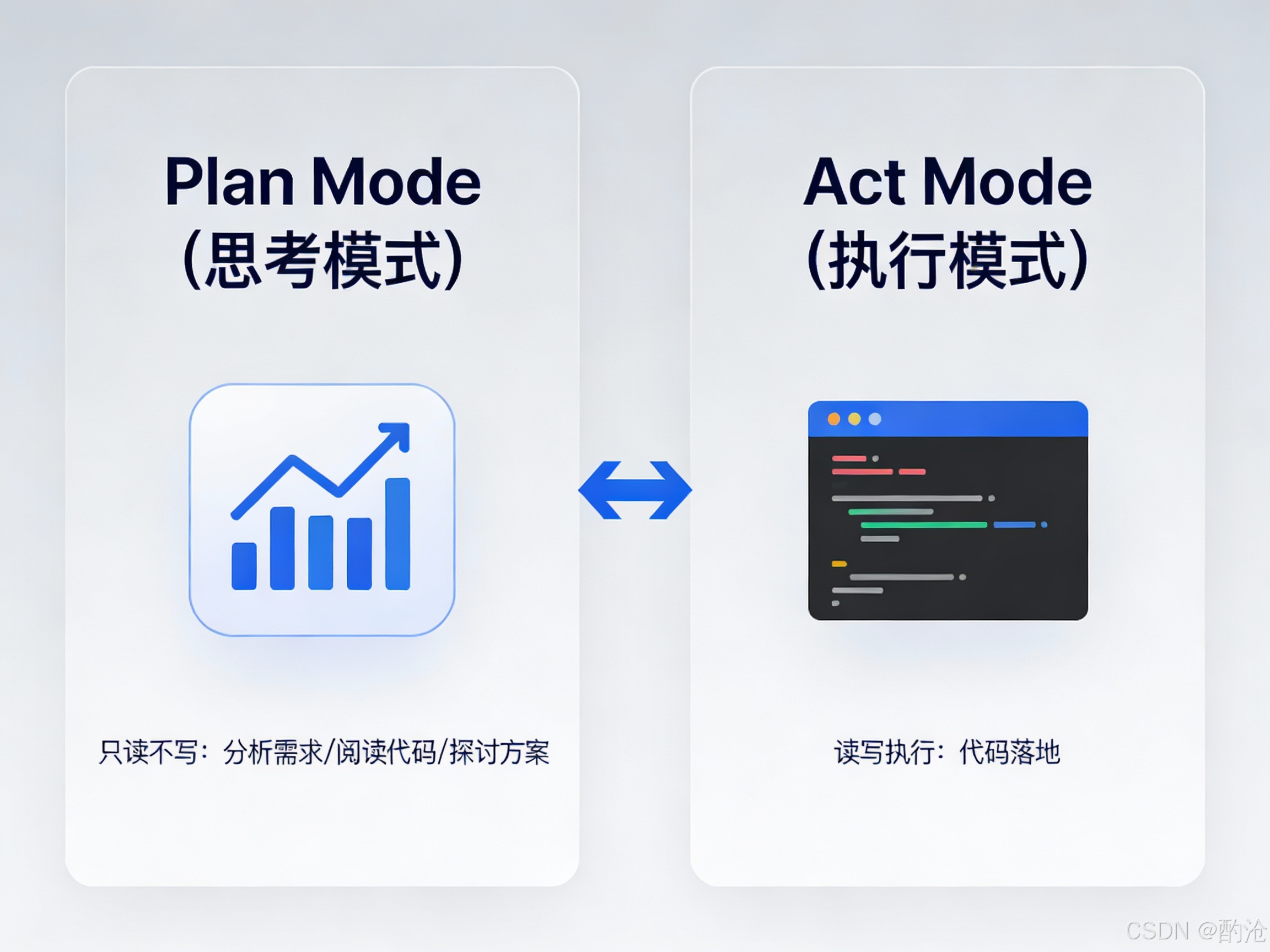 Plan Mode (思考模式): 此时 Cline 是架构师。它只读不写,专注于分析需求、阅读代码库、探讨方案。这是避免写了改,改了删的关键阶段。