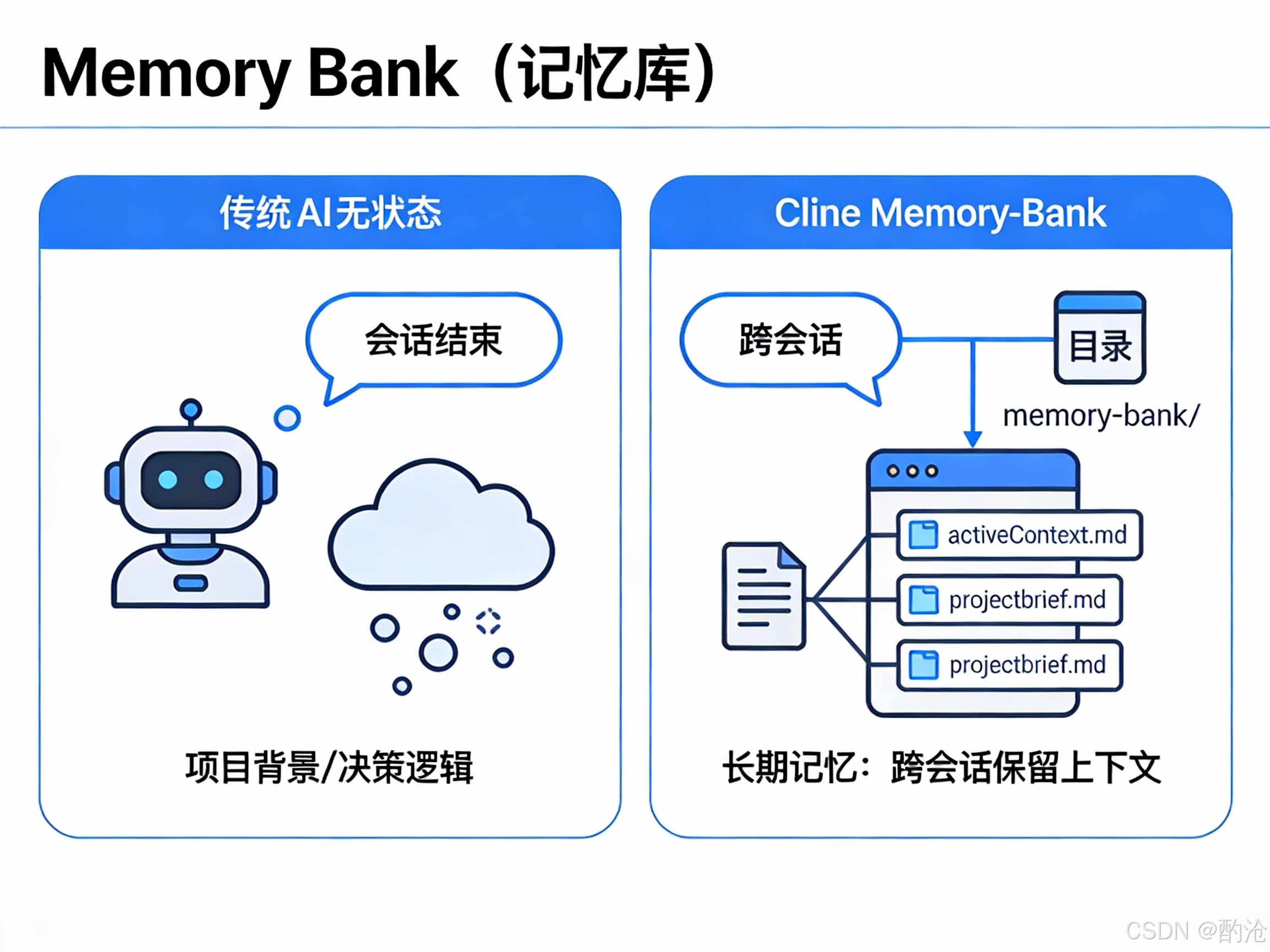 在传统的大语言模型交互中,AI 是无状态的,这意味着一旦会话结束,所有的项目背景和决策逻辑都会随之消散。Cline 通过 Memory Bank(记忆库) 机制彻底解决了这一痛点,让 AI 拥有了跨会话的长期记忆。