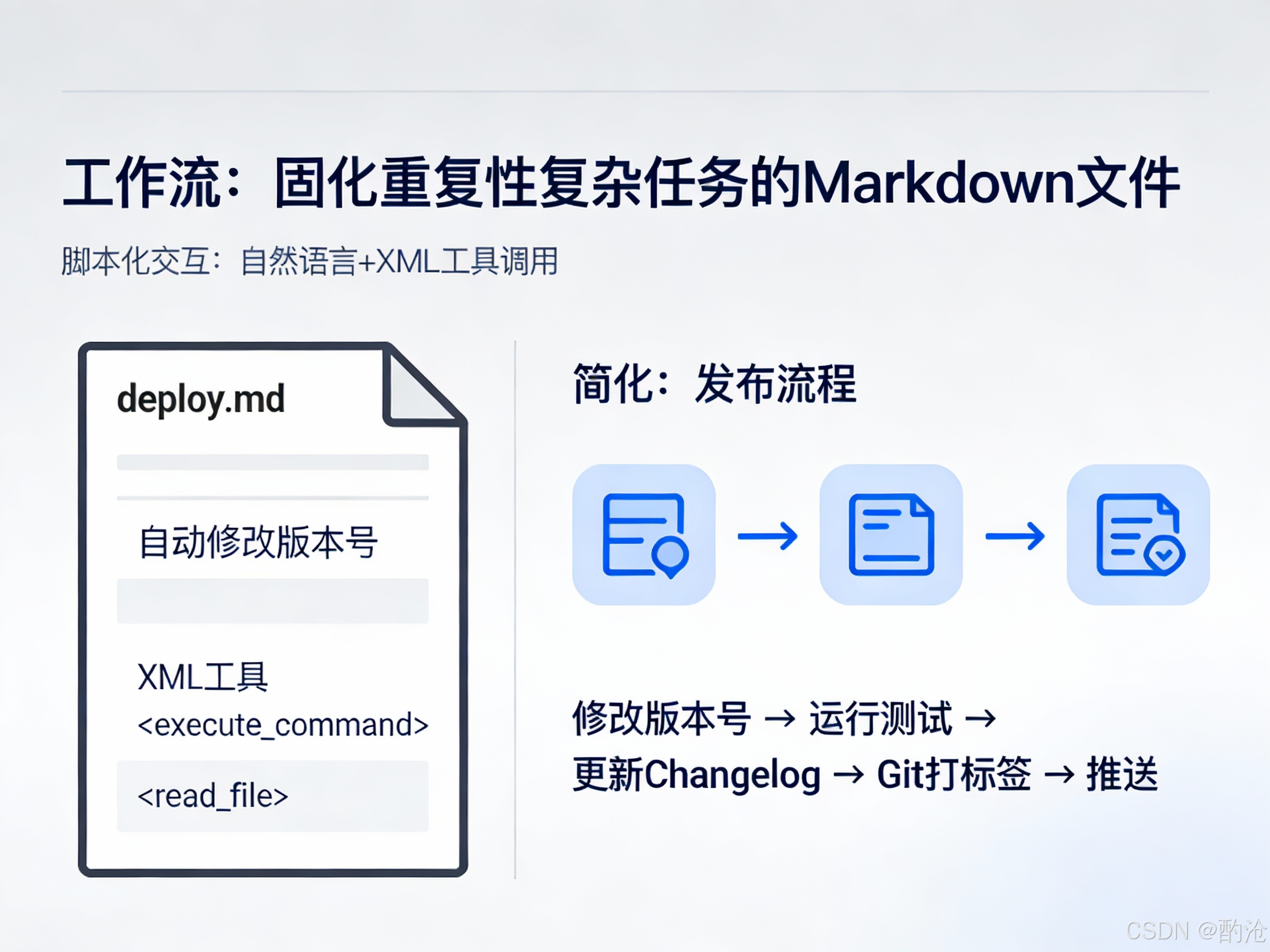 工作流是定义明确步骤的 Markdown 文件(如 /deploy.md),用于固化重复性的复杂任务。