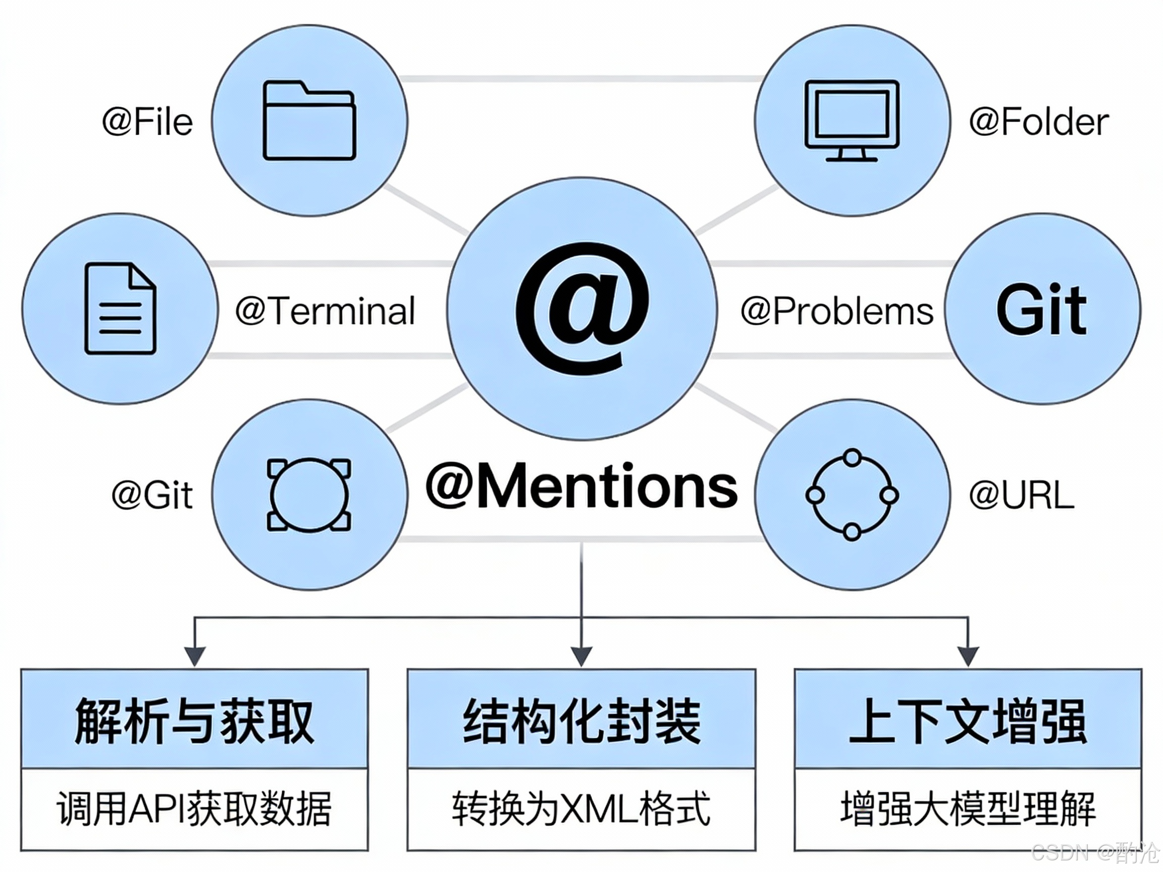 当你使用 @ 提及功能时,Cline 并非简单的文本拼接。