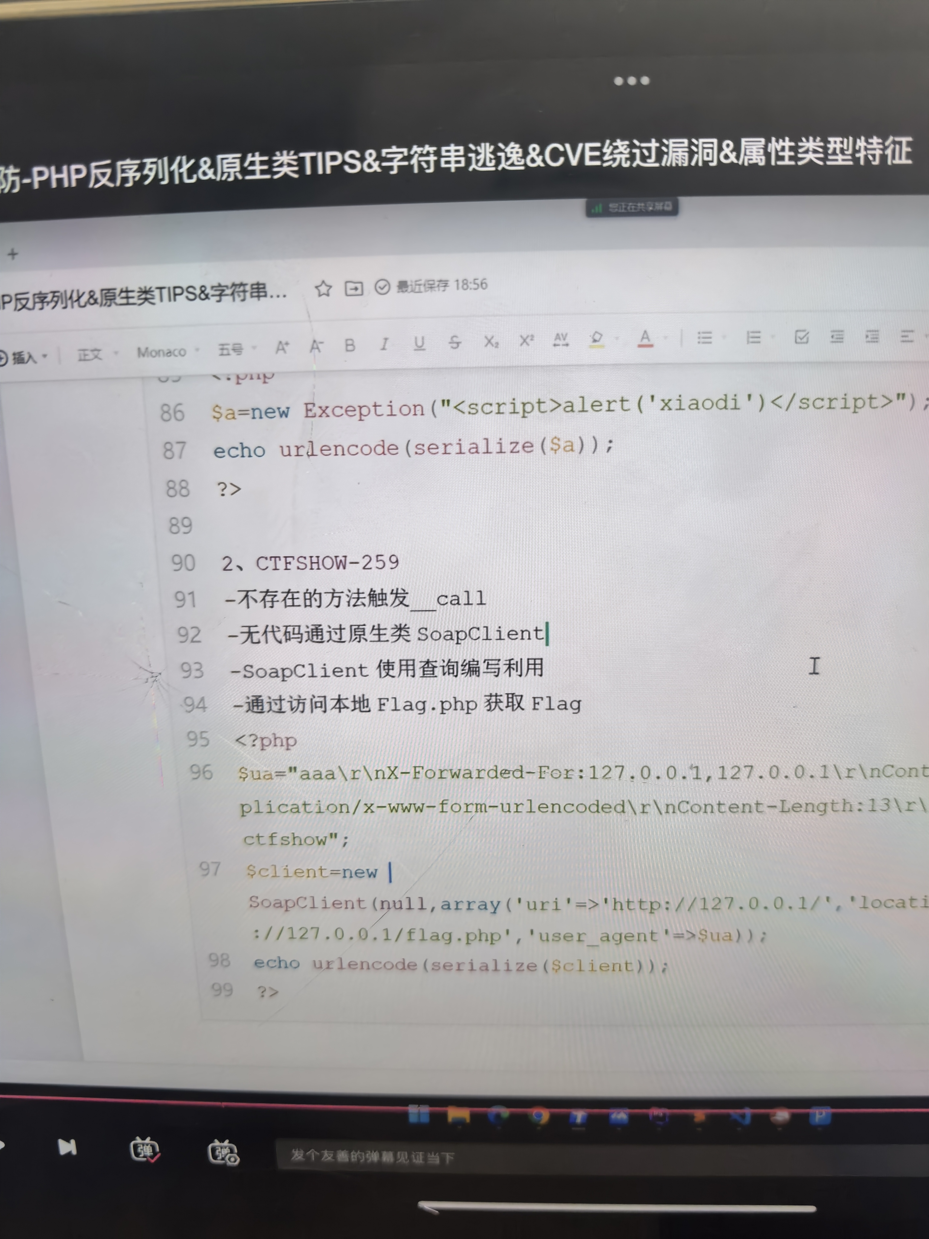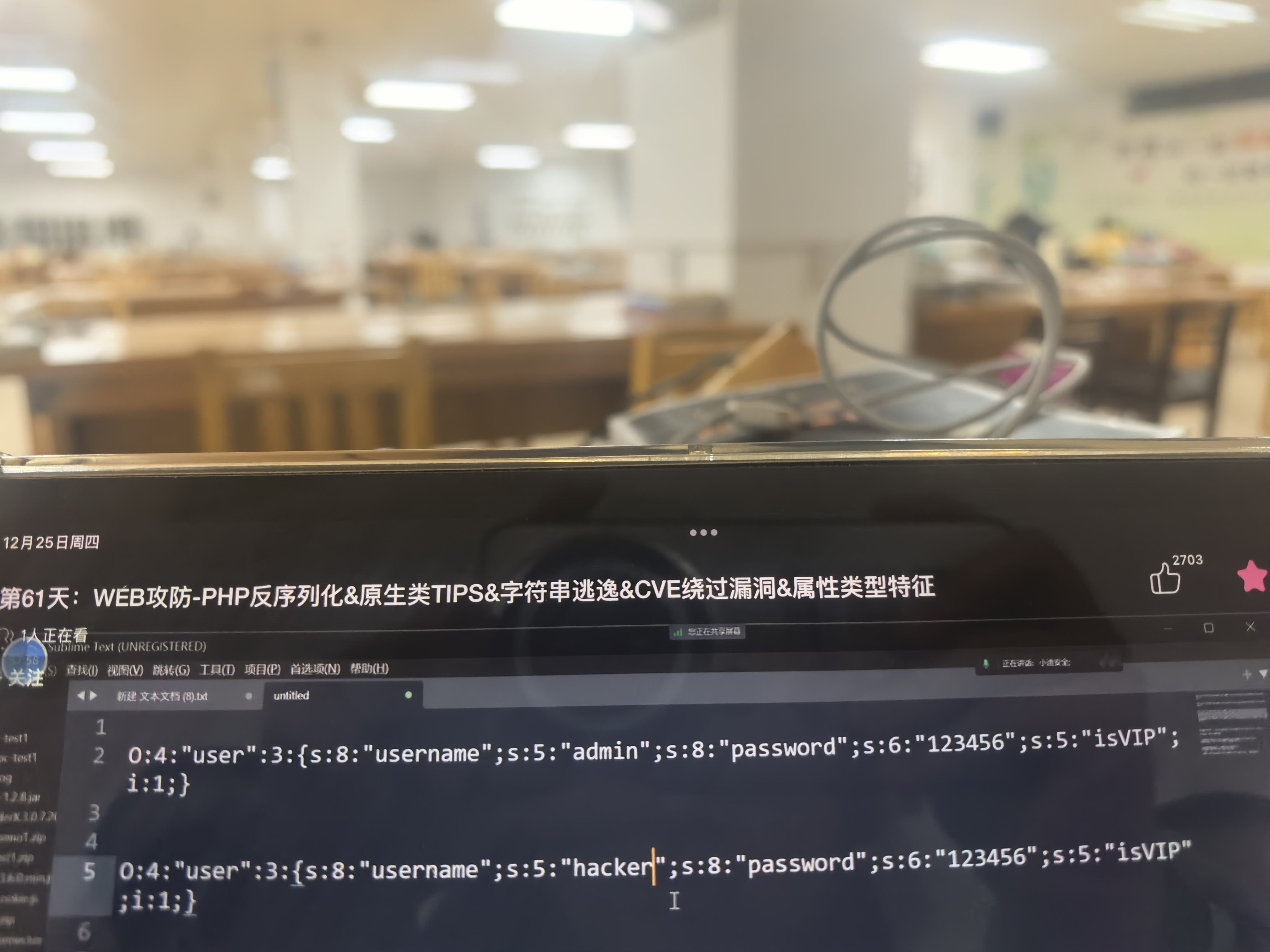 类中原本定义 public class = 'backDoor'; ( class 是字符串类型),而 __construct() 执行后, this-\>class = new backDoor(); 会把 class 属性从字符串改成 backDoor 类的对象实例------这是本质变化,序列化时保存的将是 backDoor 对象,而非原字符串。
