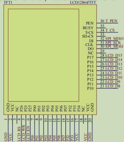 该接口是 LCD12864 与 TFTLCD 彩屏共用的,共占用 20 个管脚