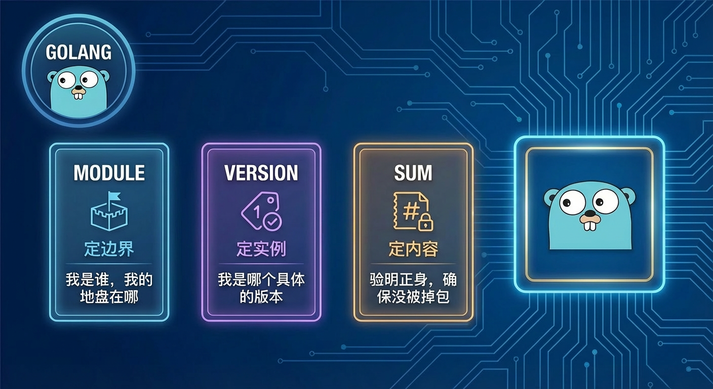 这篇不讲"怎么用",只做术语解释,增强概念:module 是什么、version 是什么、sum 是什么,以及它们在 Go 依赖体系里分别承担什么职责。