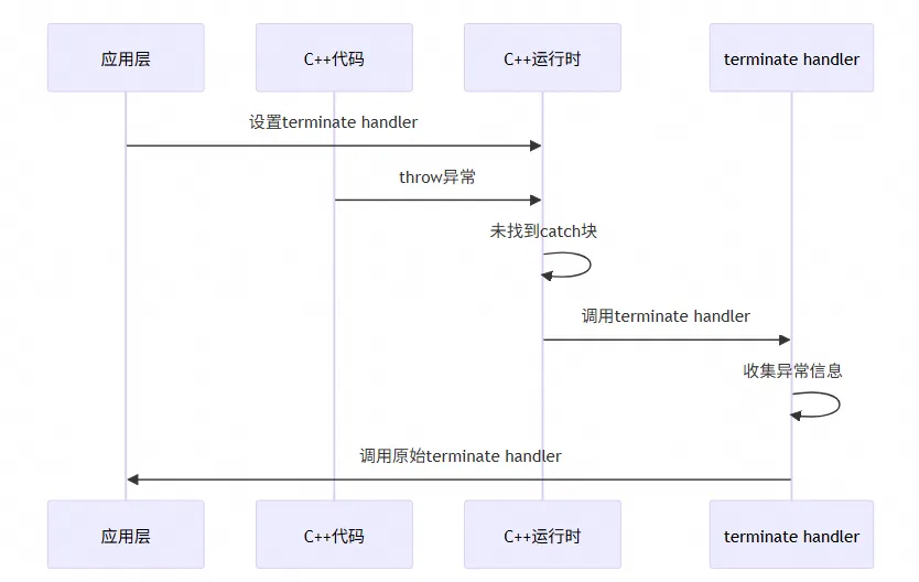 通过设置 C++ terminate handler 可以捕获未处理的 C 异常。当 C 异常未被捕获时,C++ 运行时会调用 std::terminate(),我们通过拦截这个调用来捕获异常。