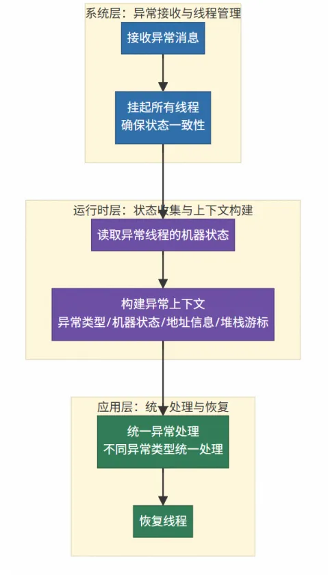 - 硬件异常 → Mach 异常: CPU 异常被 Mach 内核捕获,转换为 Mach 异常消息