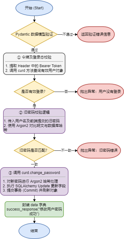 用户在已登录状态下触发修改密码操作,后端会先通过Pydantic验证数据模型,不通过报错,通过后,后端开始处理修改用户密码的请求: