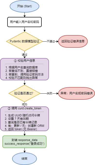 用户输入用户名和密码,后端会先通过Pydantic验证数据模型,不通过报错,通过后,首先