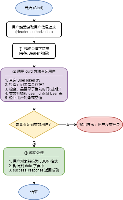 ③若通过令牌未查询到有效的用户信息(返回空值),后端直接抛出异常提示 "用户没有登录";若查询到有效的用户对象,先将用户对象转换为可序列化的 JSON 格式数据,再将该用户信息封装到字典类型的 data 中,通过 success_response 返回给前端,同时提示 "获取用户信息成功"。