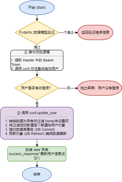 用户在已登录状态下触发更新用户信息操作(如修改个人资料),后端会先通过Pydantic验证数据模型,不通过报错,通过后,后端开始处理更新用户信息的请求: